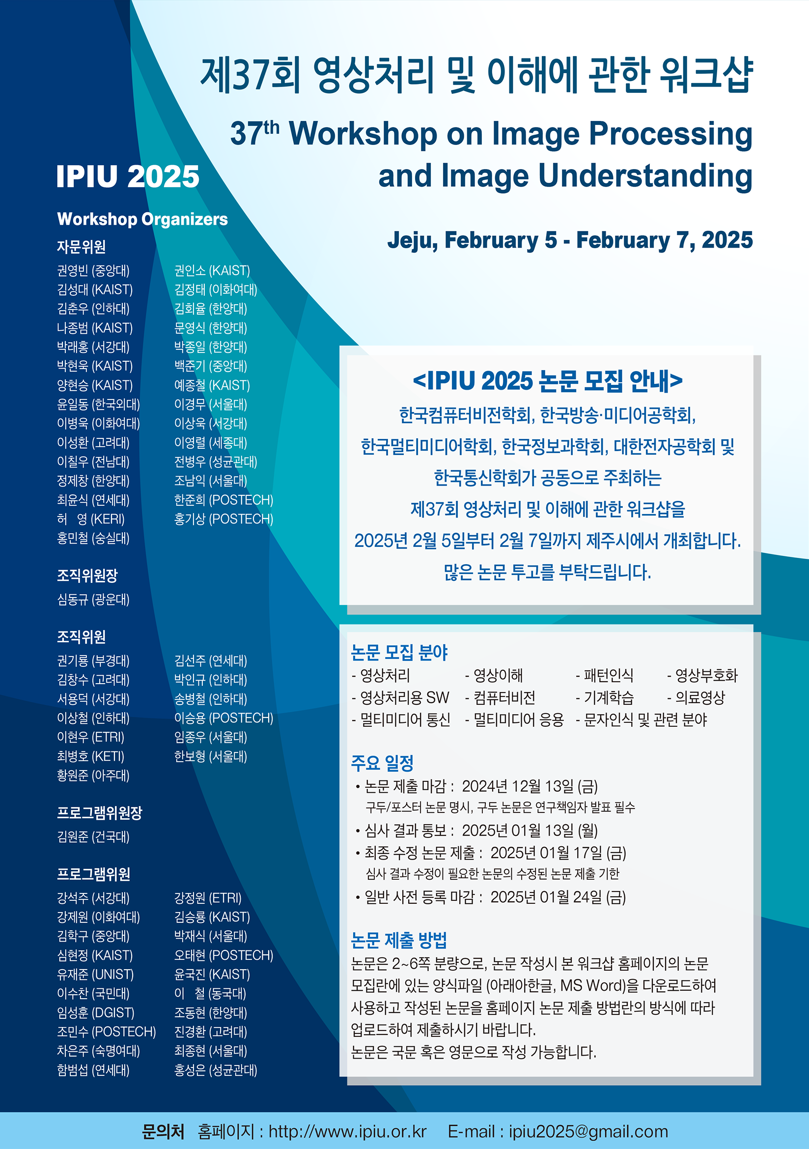 제 37 회 영상처리 및 이해에 관한 워크샵을 2025년 2월 5일부터 2월 7일까지 제주시에서 개최합니다.